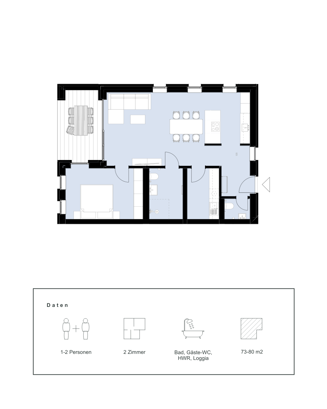 Dieser Wohnungstyp verbindet komfortables Wohnen mit funktionaler Aufteilung. Zwei Zimmer ermöglichen Rückzug und Flexibilität – perfekt für Paare, Berufstätige oder kleine Haushalte mit Platzbedarf für Homeoffice oder Gäste.