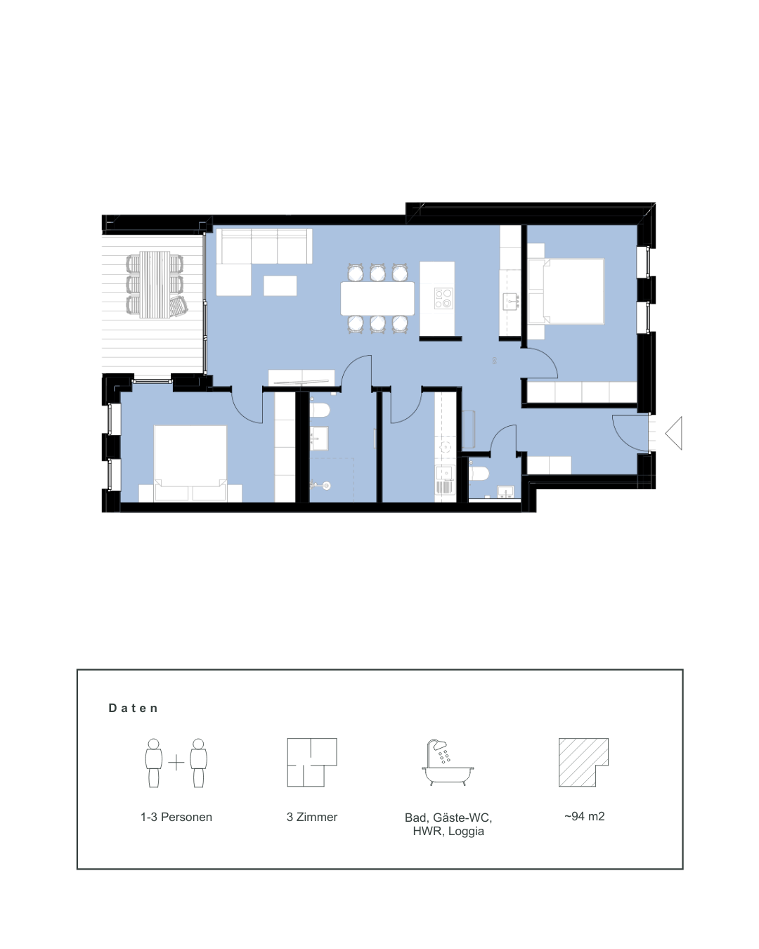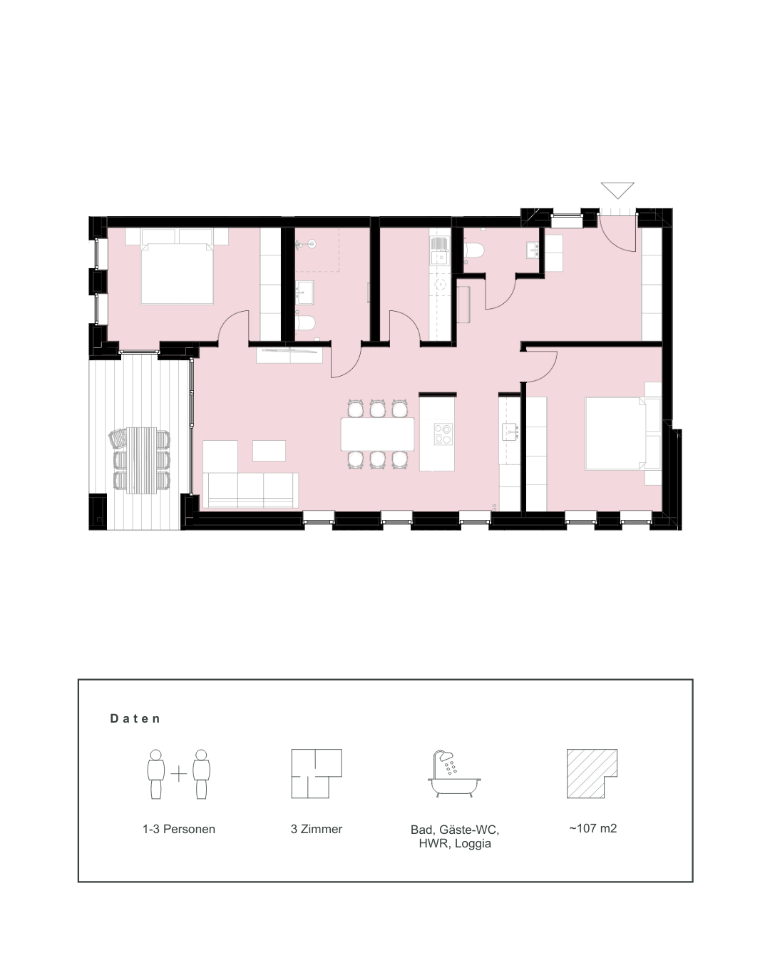 Mit drei Zimmern und weitläufigem Wohnbereich bietet dieser Grundriss ausreichend Raum für Familien oder anspruchsvolle Paare. Klare Zonen für Wohnen, Schlafen und Arbeiten sorgen für Struktur und Wohnqualität.