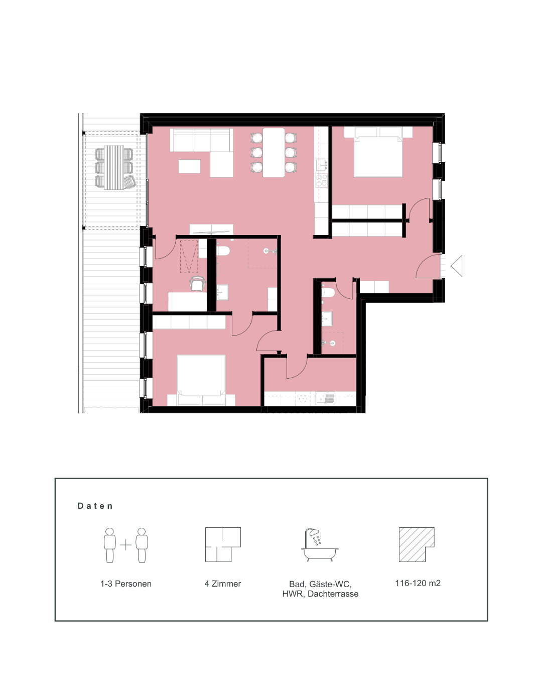 Der größte Wohnungstyp überzeugt durch seine offene Raumwirkung und zusätzliche Dachterrasse. Ideal für Familien oder alle, die innen wie außen großzügig wohnen möchten – mit viel Licht, Weite und Privatsphäre.